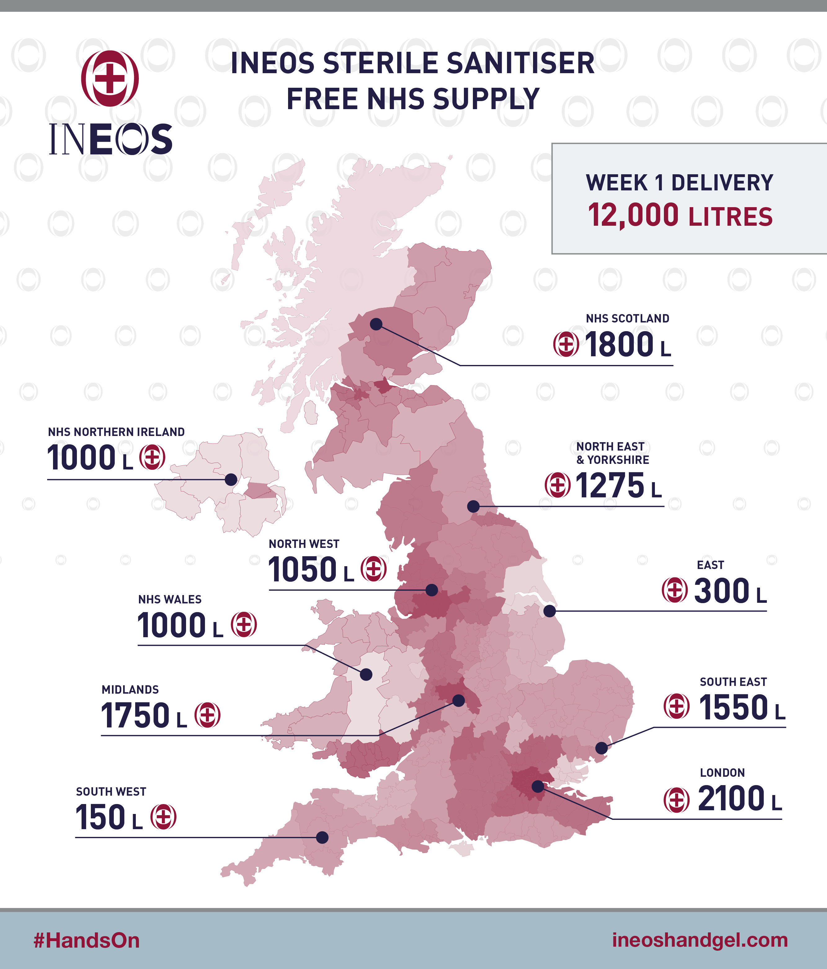 Working closely with NHS Trusts, as of today, INEOS hand sanitisers are being delivered to 28 hospitals across the UK including Grangemouth, Halton, Teesside, Derby and London. Wider distribution will follow as the plant reaches full capacity.
