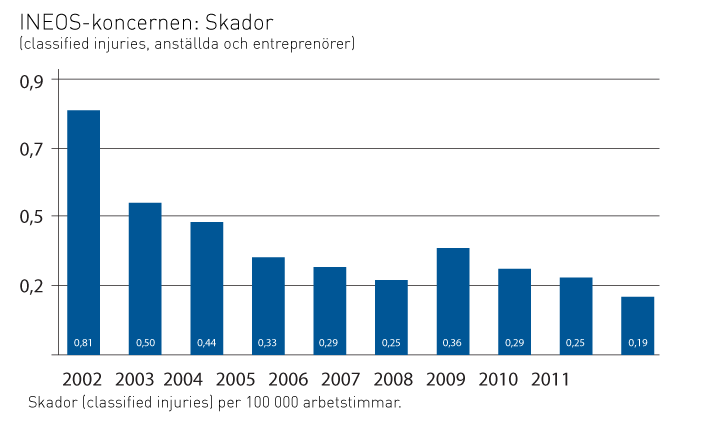 Vad beträffar nyckelparametrar har INEOS fokuserat mycket närmare på personskador, miljöresultat och icke-efterlevnad av regler, processutrustningens tekniska tillförlitlighet och utsläpp av kemikalie, granskningspriser och tillbudsincidenter. Ju fler tillbud som vi har kännedom om, desto bättre chans har vi att lära från dessa och undvika att riktiga incidenter inträffar. Av den här anledningen uppmuntrar vi aktivt att vår personal rapportera alla tillbud.